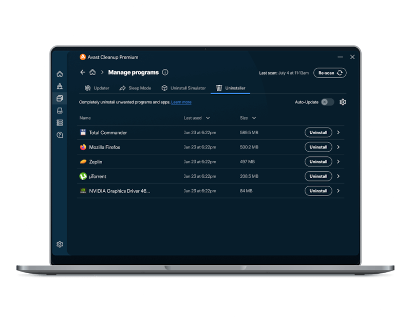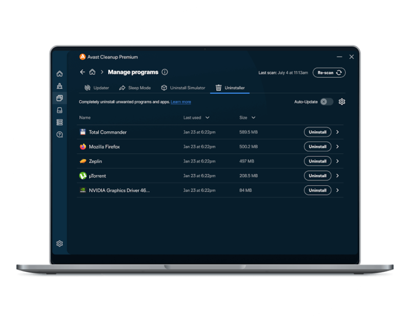 Bloatware verwijst naar alle voorgeïnstalleerde software die u eigenlijk niet nodig hebt en waarschijnlijk niet wilt: apps die u niet gebruikt, afleidende werkbalken, verlopen proefversies van software en adware die u belaagt met pop-ups of u zelfs kan bespioneren. Avast Cleanup scant uw computer grondig om elk spoor van pc-bloatware te verwijderen.