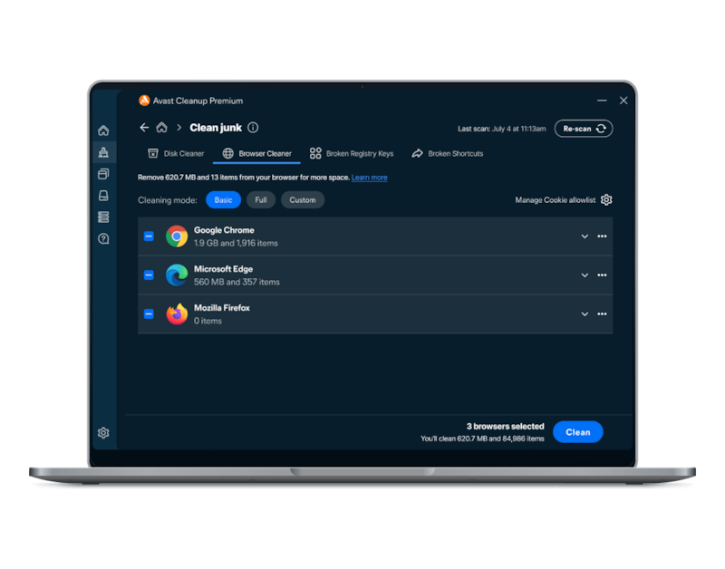 Onvoldoende schijfruimte? Met Avast Cleanup scant u alle hoeken en gaten van uw pc en verwijdert u gigabytes aan ongewenste bestanden van honderden toepassingen, browsers, en zelfs Windows.