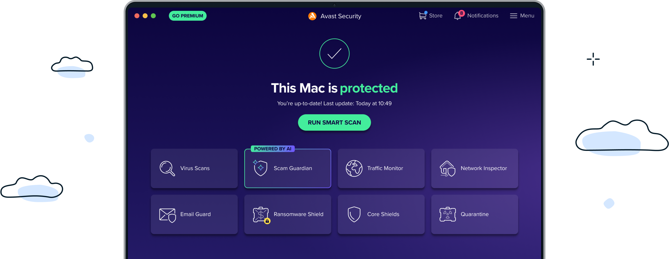 Malware is niet het enige wat uw Mac bedreigt. Ook scams, schadelijke websites en kwetsbare wifinetwerken kunnen uw veiligheid en privacy in gevaar brengen. Avast Security voor Mac helpt u te beschermen tegen deze dreigingen en geeft u AI-gedreven advies en bescherming tegen online scams.